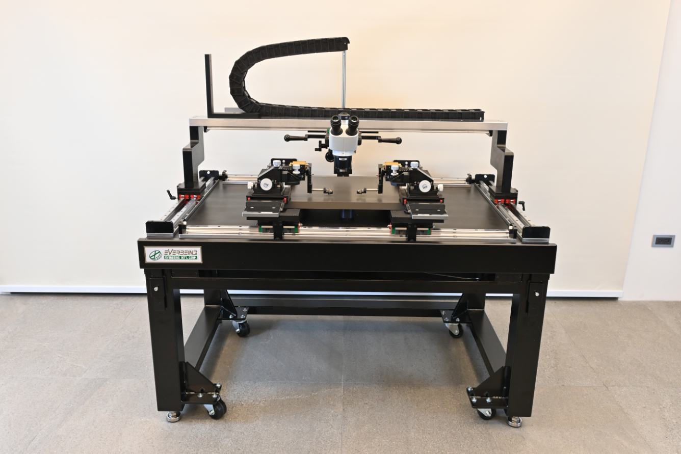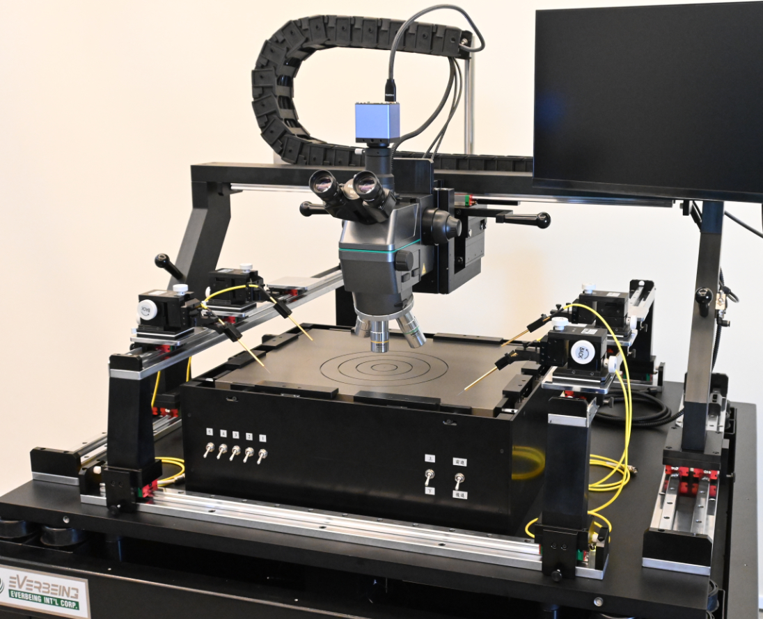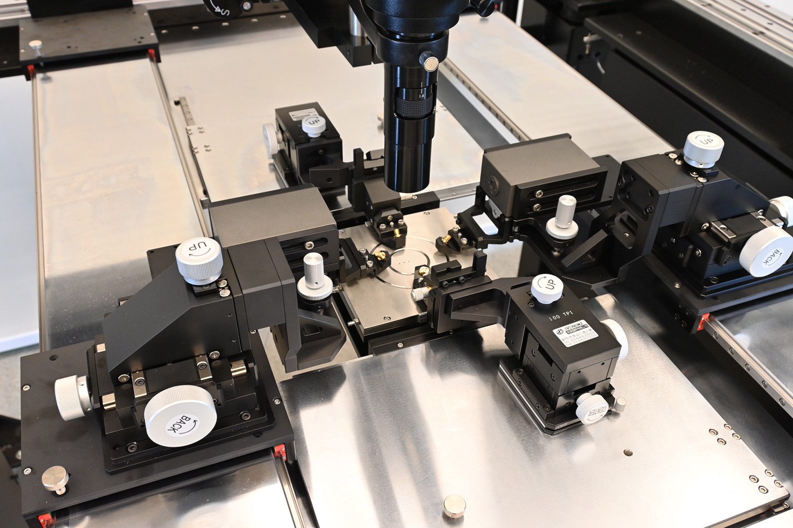 有別於直流量測的探針座,高頻量測時探針座本身的重心配置的穩定性要高之外,控制探針的機械調整精度必需1 micron 以上,下針後滑行距離可細膩調整到不同應用及材料所需的接觸應力。頻率愈高,間距愈窄,控制探針的每一步的步進量也需愈小。頻率在90GHz以上的架設,在探針座本身的穩定及精度之外,要將探針座背另外一個倍頻器一起規劃,出現了其他的挑戰,如何將大尺寸的倍頻器收納及超小倍頻器在瞬間產生大量的熱能的消散問題,設計上是一大考驗。
